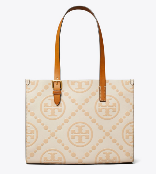 Small T Monogram Contrast Embossed Tote - Longan / New Cream